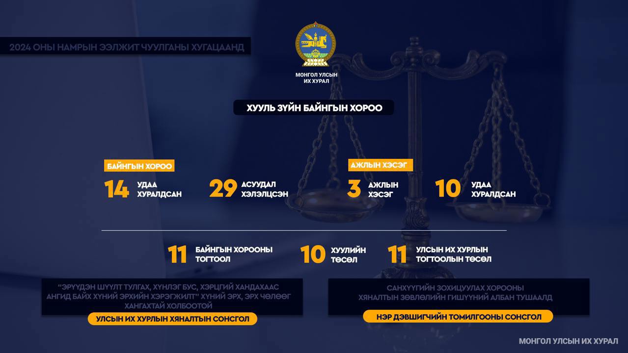 Улсын Их Хурлын 2024 оны намрын ээлжит чуулганы хугацаанд Хууль зүйн байнгын хороо эрхлэх асуудлынхаа хүрээнд Монгол Улсын Үндсэн хууль, Монгол Улсын эрх зүйн бодлого, хүний эрх, эрх чөлөө, түүний баталгаа, гэмт хэрэгтэй тэмцэх, урьдчилан сэргийлэх бодлогын хүрээнд Улсын Их Хуралд өргөн мэдүүлсэн хууль, Улсын Их Хурлын бусад шийдвэрийн төслийн талаар Байнгын, дэд хороо болон нэгдсэн хуралдаанаар хэлэлцэх, тодорхой асуудлаар санал, дүгнэлт гаргах, Улсын Их Хурлын хянан шалгах чиг үүргийг хэрэгжүүлэх харьяа байгууллагын үйл ажиллагаанд тавих хяналтыг хэрэгжүүлэх, үүрэг, чиглэл өгөх зэрэг ажлыг хэрэгжүүлэн ажилласан байна. Тус Байнгын хороо өнөөдөр (2025.01.29) хэвлэлийн бага хурал зохион байгуулж, Д.Цогтбаатар дарга ээлжит чуулганы хугацааны үйл ажиллагааныхаа тайланг танилцуулж, сэтгүүлчдэд мэдээлэл хийлээ.
