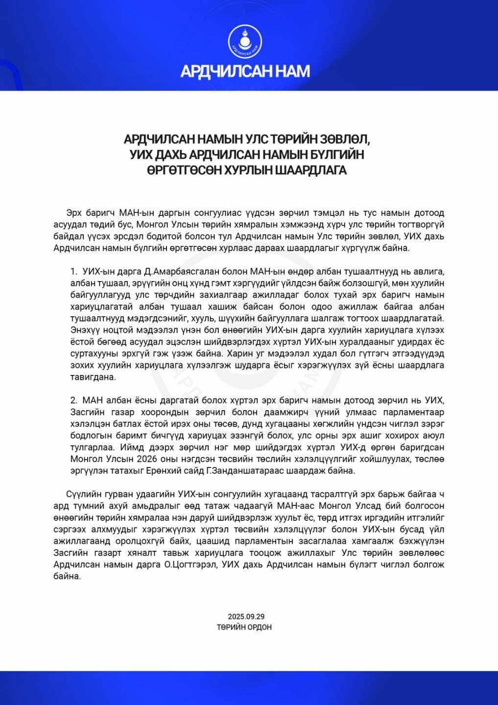 2. МАН албан ёсны даргатай болох хүртэл эрх баригч намын дотоод зөрчил нь УИХ, Засгийн газар хоорондын зөрчил болон даамжирч үүний улмаас парламентаар хэлэлцэн батлах ёстой ирэх оны төсөв, дунд хугацааны хөгжлийн үндсэн чиглэл зэрэг бодлогын баримт бичгүүд хариуцах эзэнгүй болох, улс орны эрх ашиг хохирох аюул тулгарлаа. Иймд дээрх зөрчил нэг мөр шийдэгдэх хүртэл УИХ-д өргөн баригдсан Монгол Улсын 2026 оны нэгдсэн төсвийн төслийн хэлэлцүүлгийг хойшлуулах, төслөө эргүүлэн татахыг Ерөнхий сайд Г.Занданшатараас шаардаж байна.