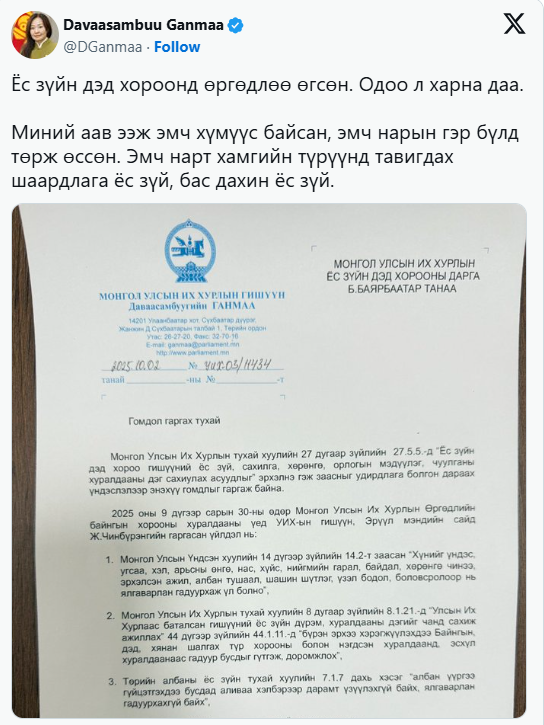 | УИХ-ын гишүүн Д.Ганмаа өөрийг нь дарамталсан Эрүүл мэндийн сайд Ж.Чинбүрэнг Ёс зүйн дэд хороонд өглөө |