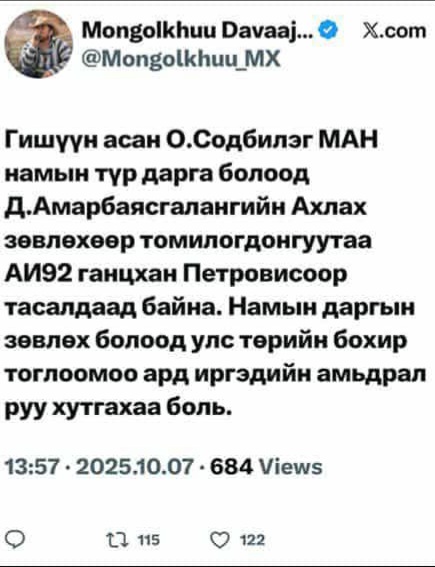 | "Петровис"-ын О. Содбилиг улс төрийн зорилгоор АИ92 шатахууныг хомсдолд оруулав уу |