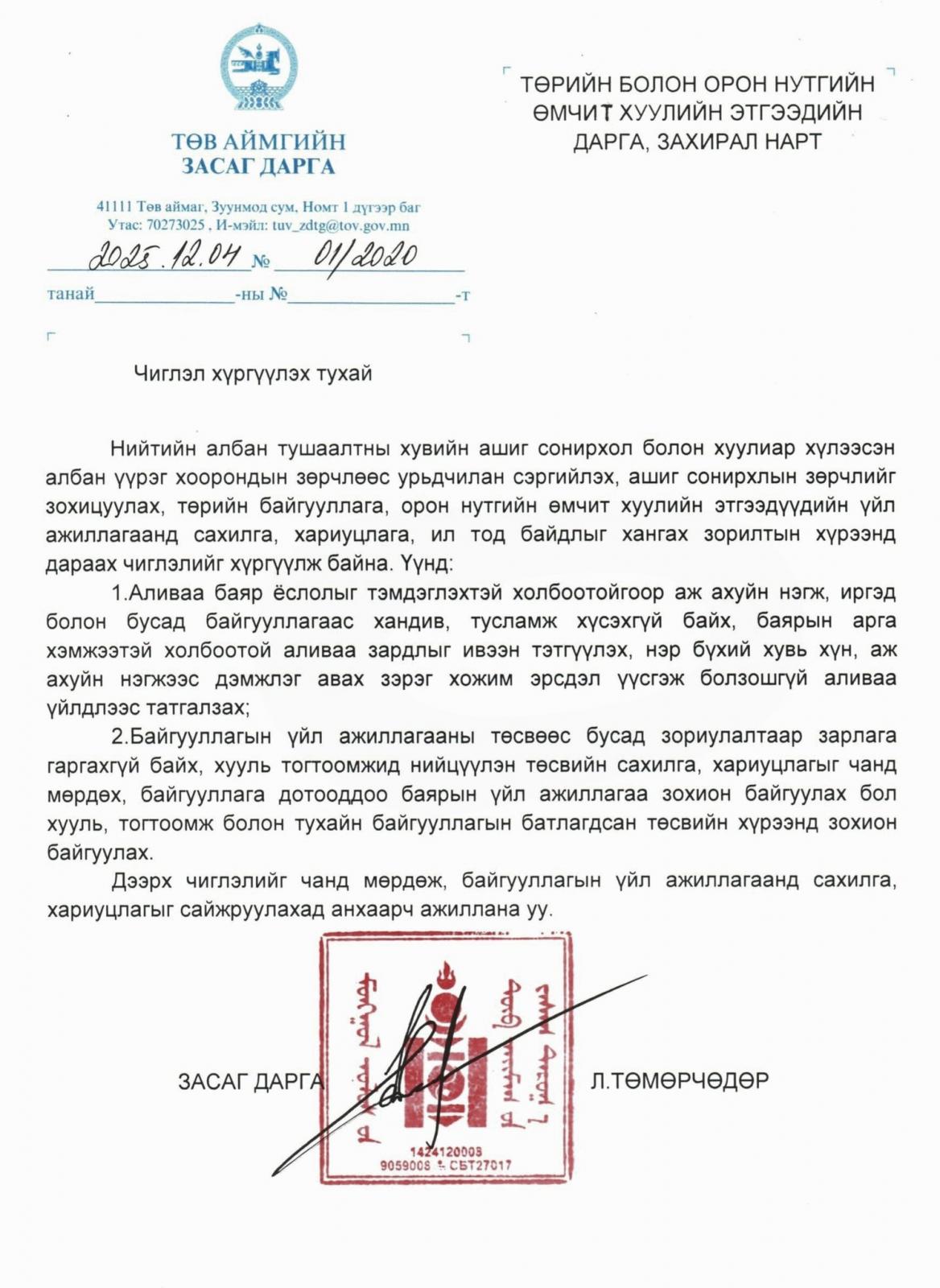 Төрийн байгууллагуудад харилцагч байгуулагуудаас шинэ жилийн баярын дэмжлэг гэж авдаг болжээ. Үүнээс урьдчилан сэргийлж, Төв аймгийн засаг дарга төрийн болон орон нутгийн өмчит хуулийн этгээдүүдийн дарга, захирал нарт чиглэл өглөө. Эндээс онцолбол, аливаа баяр ёслолыг тэмдэглэхтэй холбоотой хандив тусламж хүсэхгүй байх, аливаа зардлыг тэтгүүлэхгүй байх нь хожим үүсэх эрсдлээс сэргийлнэ гэж анхааруулжээ.