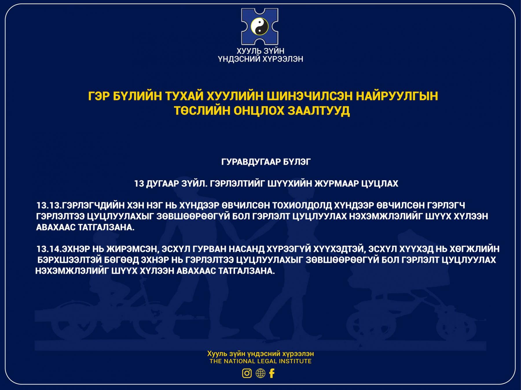 Гэр бүлийн тухай хуулийн шинэчилсэн найруулгын төслийн онцлох заалтаас хүргэж байна.