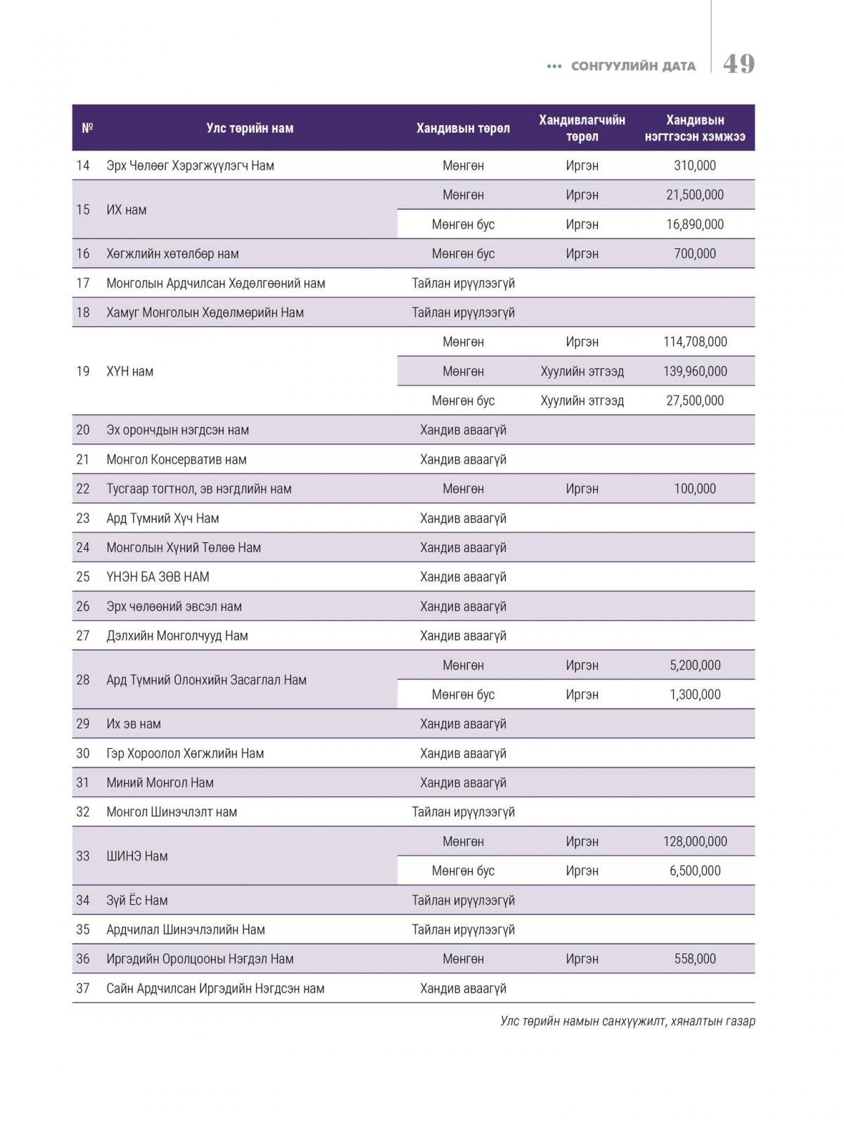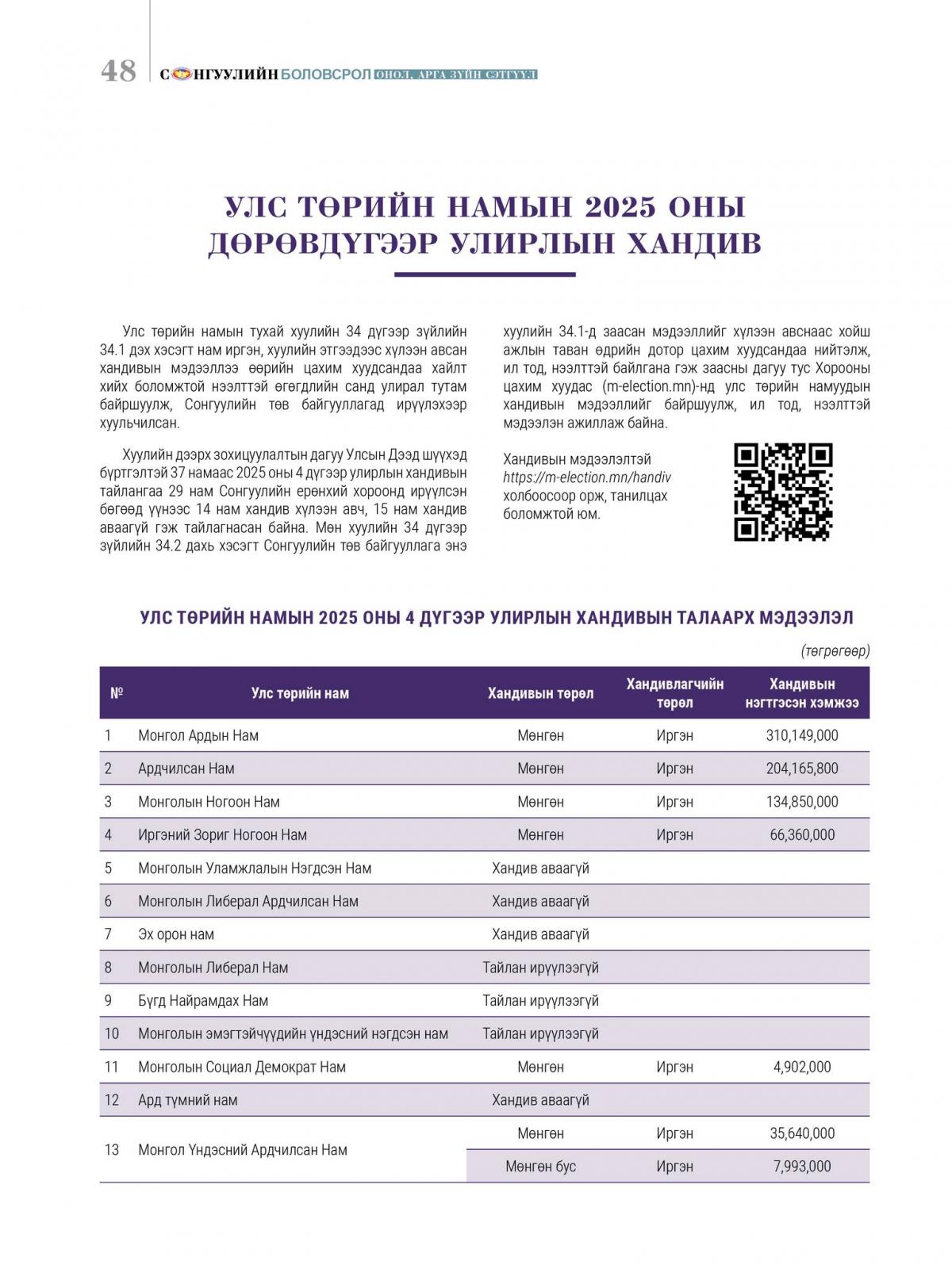 Хуулийн дээрх зохицуулалтын дагуу Улсын Дээд шүүхэд бүртгэлтэй 37 намаас 2025 оны 4 дүгээр улирлын хандивын тайлангаа 29 нам Сонгуулийн ерөнхий хороонд ирүүлсэн бөгөөд үүнээс 14 нам хандив хүлээн авч, 15 нам хандив аваагүй гэж тайлагнасан байна. Мөн хуулийн 34 дүгээр зүйлийн 34.2 дахь хэсэгт Сонгуулийн төв байгууллага энэ хуулийн 34.1-д заасан мэдээллийг хүлээн авснаас хойш ажлын таван өдрийн дотор цахим хуудсандаа нийтэлж, ил тод, нээлттэй байлгана гэж заасны дагуу тус Хорооны цахим хуудас (m-election.mn)-нд улс төрийн намуудын хандивын мэдээллийг байршуулж, ил тод, нээлттэй мэдээлэн ажиллаж байна. Хандивын мэдээлэлтэй https://m-election.mn/handiv холбоосоор орж, танилцах боломжтой юм.