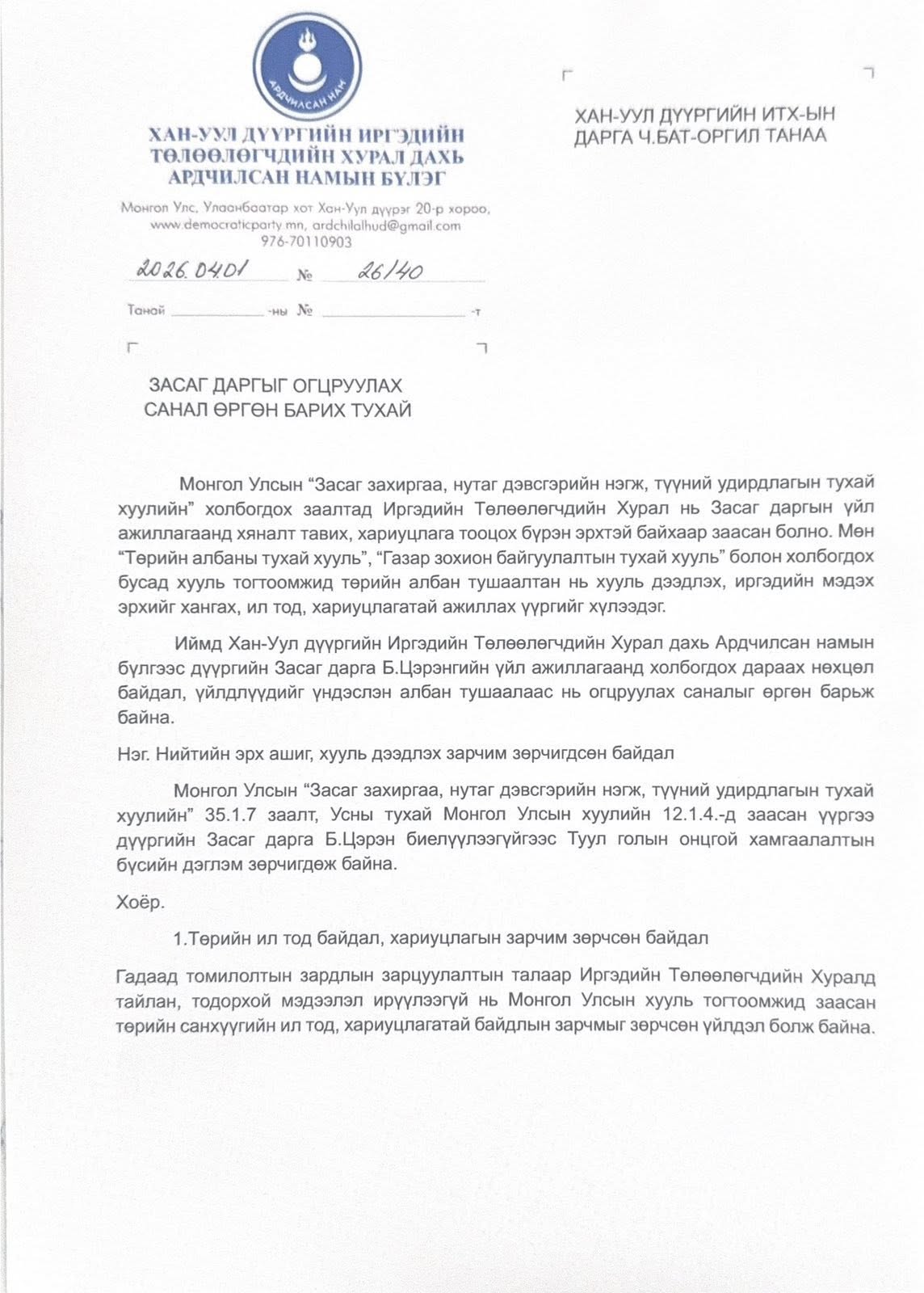 | ХУД-ийн Засаг дарга Б.Цэрэнг огцруулах таван үндэслэл |
