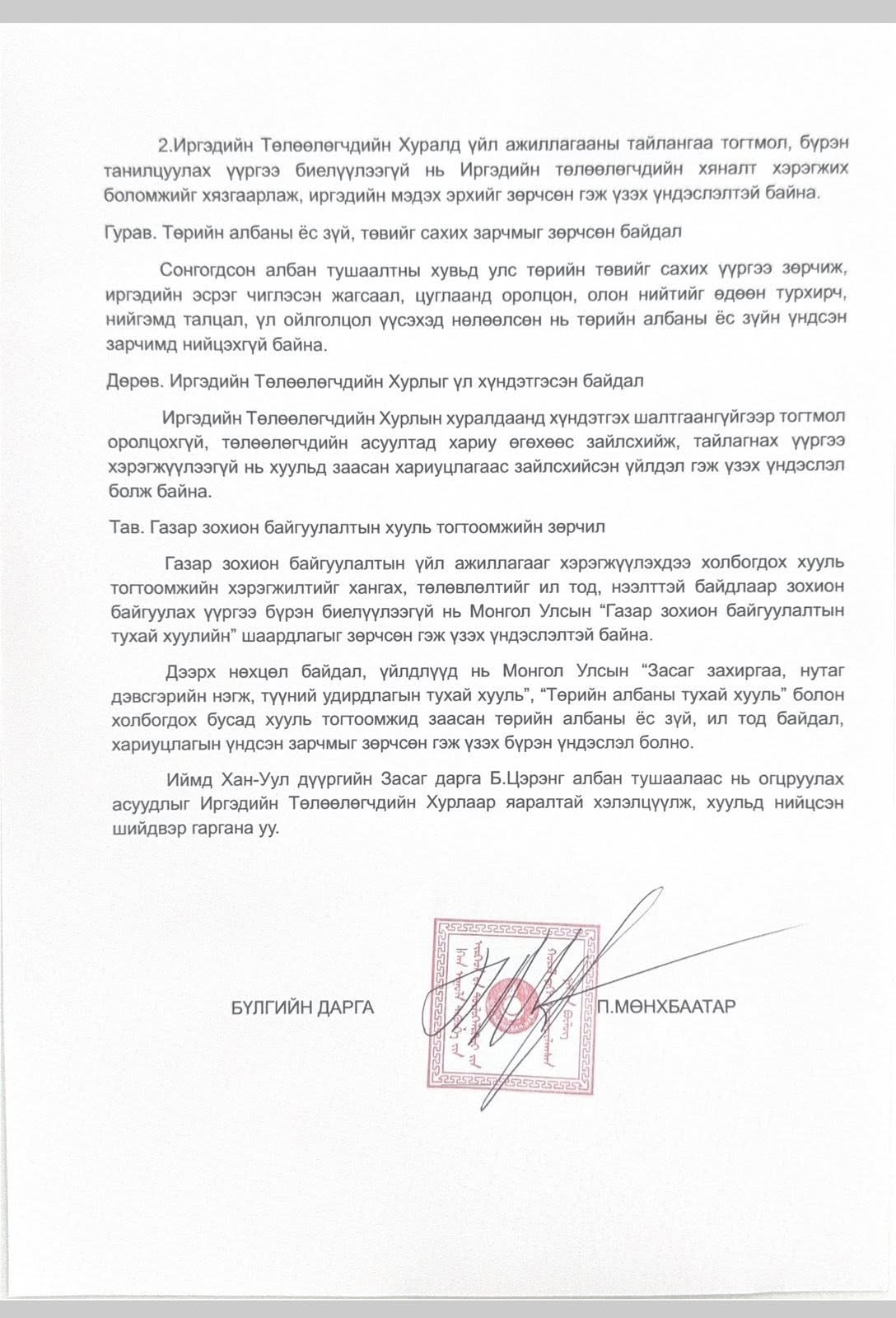 Монгол Улсын “Засаг захиргаа, нутаг дэвсгэрийн нэгж, түүний удирдлагын тухай хууль”, “Төрийн албаны тухай хууль” болон холбогдох бусад хууль тогтоомжид заасан төрийн албаны ёс зүй, ил тод байдал, хариуцлагын үндсэн зарчмыг зөрчсөн гэж үзэх бүрэн үндэслэл болж байна гэж ХУД-ийн ИТХ-ын АН-ын бүлэг үзсэн.