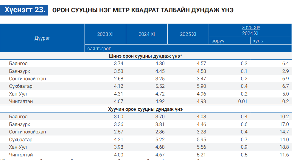 2025 оны 11 дүгээр сард шинэ орон сууцны 1 метр квадрат талбайн дундаж үнэ 4.97 сая төгрөг болж, Сүхбаатар дүүрэгт хамгийн өндөр буюу 5.9 сая төгрөгийн үнэтэй байна. Шинэ орон сууцны дундаж үнэ өмнөх оны мөн үетэй харьцуулахад Сонгинохайрхан дүүрэгт 6.9 хувь (224.1 мянган төгрөг)-аар өссөн нь хамгийн өндөр, Чингэлтэй дүүрэгт 0.2 хувь (8.0 мянган төгрөг)-аар өссөн нь хамгийн бага байна.