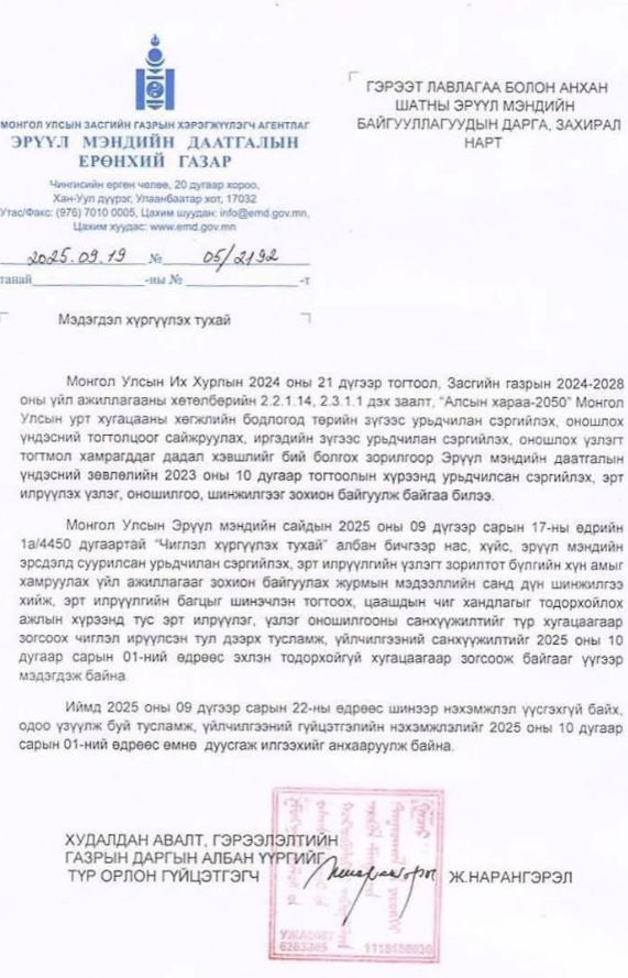 Гэвч энэхүү эрт илрүүлэг, урьдчилан сэргийлэх оношилгоог тодорхойгүй хугацаагаар зогсоож байгааг Эрүүл Мэндийн Даатгалын Ерөнхий Газраас гэрээт лавлагаа болон анхан шатны эрүүл мэндийн байгууллагууддаа мэдэгдсэн байна. Тухайн мэдэгдэлд түр зогсоож байгаа шалтгаанаа "Нас, хүйс, эрүүл мэндийн эрсдэлд суурилсан урьдчилан сэргийлэх, эрт илрүүлгийн үзлэгт зорилтот бүлгийн хүн амыг хамруулах үйл ажиллагааг зохион байгуулах журмын мэдээллийн санд дүн шинжилгээ хийж, эрт илрүүлгийн багцыг шинэчлэн тогтоох, цаашдын чиг хандлагыг тодорхойлох ажлын хүрээнд тус эрт илрүүлэг, үзлэг оношилгооны санхүүжилтийг түр хугацаагаар зогсоох чиглэл ирүүлсэн тул дээрх тусламж, үйлчилгээний санхүүжилтийг 2025 оны аравдугаар сарын 1-ний өдрөөс эхлэн тодорхойгүй хугацаагаар зогсоож байна" гэжээ. Мөн 2025 оны есдүгээр сарын 22-ны өдрөөс эхлэн шинээр нэхэмжлэл үүсгэхгүй байхыг анхааруулсан байна.