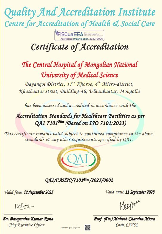 АШУҮИС-ийн төв эмнэлэг Монголын эрүүл мэндийн байгууллагуудаас анх удаа "INTERNATIONAL ORGANIZATION FOR STANDARIZATION ISO7101:2023 HEALTHCARE ORGANIZATION MANAGEMENT" стандартыг амжилттай нэвтрүүллээ. Олон улсын чанарын баталгаажилт хийх эрх бүхий QAI (Quality and Accreditation Institute) байгууллага нь олон улсын 16 стандартын дагуу магадлан итгэмжлэдэг. Тус байгууллагын шинжээч нар АШУҮИС-ийн Төв эмнэлэгт 2025 оны 05 дугаар сарын 12,13,14-ний өдрүүдэд ажилласан бөгөөд зөвлөмжийг хоёр сарын хугацаанд хэрэгжүүлсэн бөгөөд ISO7101:2023 стандартын шинэ шалгуураар Монгол улсын эмнэлгүүдээс анх удаа амжилттай үнэлүүлж гэрчилгээг хүлээн авлаа.