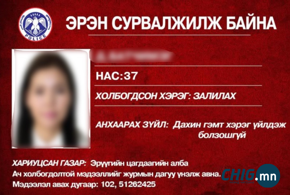 | Дахин залилах гэмт хэрэг үйлдэж болзошгүй этгээдийг эрэн сурвалжилж байна |