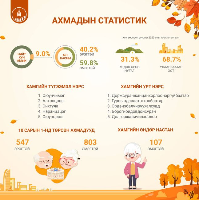 Өнөөдөр тохиож буй Олон улсын ахмадын баярын өдрөөр Үндэсний статистикийн хороо ахмад настнуудын талаарх статистик мэдээллийг танилцууллаа.