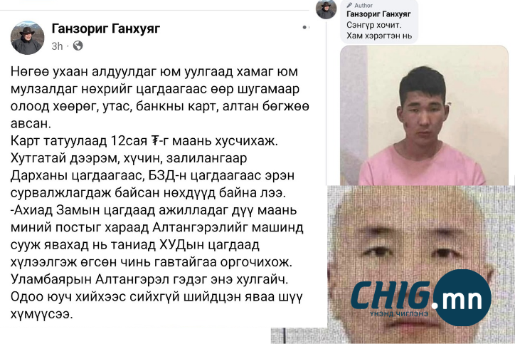 Хутгатай дээрэм, хүчин, залилангаар Дарханы цагдаагаас, БЗД-н цагдаагаас эрэн сурвалжлагдаж байсан нөхдүүд байна лээ. -Ахиад Замын цагдаад ажилладаг дүү маань миний постыг хараад Алтангэрэлийг машинд сууж явахад нь таниад ХУДын цагдаад хүлээлгэж өгсөн чинь гавтайгаа оргочихож. Уламбаярын Алтангэрэл гэдэг энэ хулгайч. Одоо юуч хийхээс сийхгүй шийдцэн яваа шүү хүмүүсээ.”