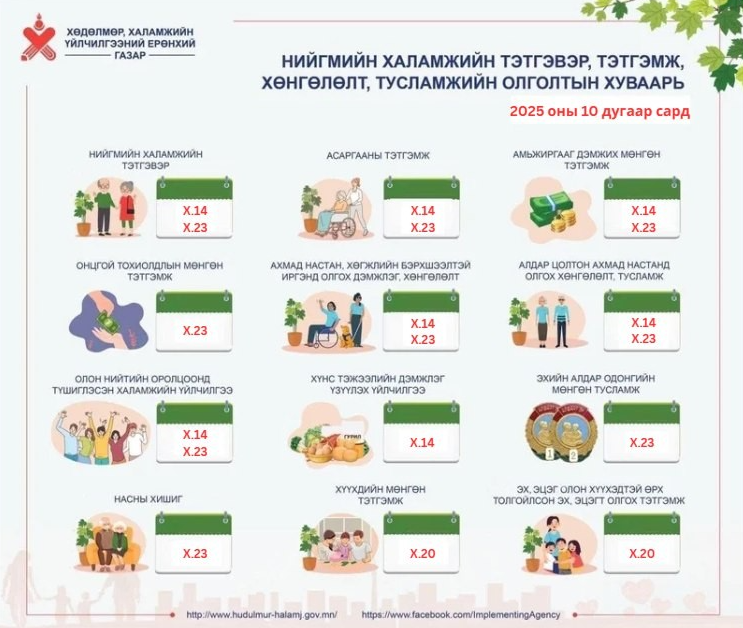 | Энэ сард хүүхдийн мөнгө, халамжийн тэтгэвэр, тэтгэмж олгох хуваарь |