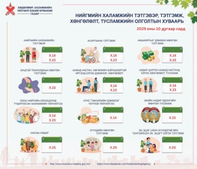 Хөдөлмөр, Халамж Үйлчилгээний Ерөнхий Газар(ХХЕҮГ)-аас энэ сард олгох нийгмийн халамжийн тэтгэвэр, тэтгэмж, хөнгөлөлт, тусламжийн хуваарийг танилцууллаа.