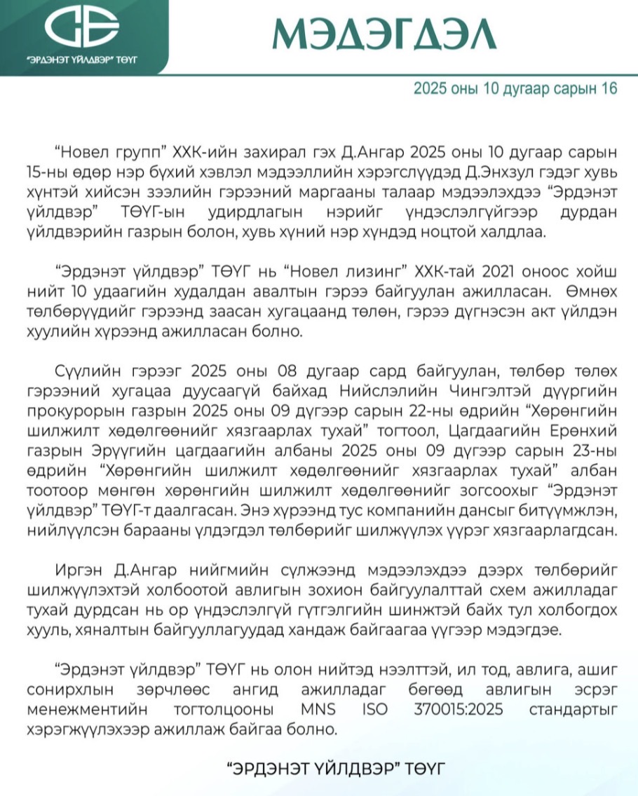 Тус мэдэгдэлд “Новел групп” ХХК-ийн захирал гэх Д.Ангар 2025 оны 10 дугаар сарын 15-ны өдөр нэр бүхий хэвлэл мэдээллийн хэрэгслүүдэд Д.Энхзул гэдэг хувь хүнтэй хийсэн зээлийн гэрээний маргааны талаар мэдээлэхдээ “Эрдэнэт үйлдвэр” ТӨҮГ-ын удирдлагын нэрийг үндэслэлгүйгээр дурдан үйлдвэрийн газрын болон, хувь хүний нэр хүндэд ноцтой халдлаа.
