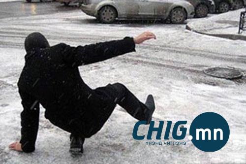 Түүнчлэн эрүүл мэндийн байгууллагаас халтирч унахаас сэргийлж, бага зэрэг өвдгөө нугалан, урагш бөхийж алхах, резинэн ултай гутал өмсөх, зам гарахдаа гүйхгүй байх зэргийг зөвлөдөг. Тохойн үеийг тэнийлгэж, гараа алдалж унахад бугуйн яс хугарч, шөрмөс сунаж тасрах аюултай байна.