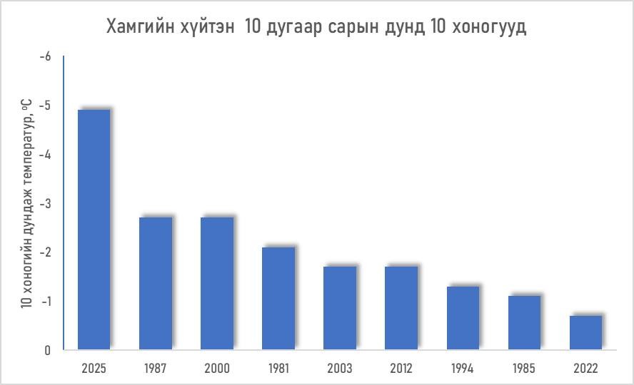 Энэ нь 1981 оноос хойших хамгийн хүйтэн 10 хоног болсон гэж Цаг уур орчны шинжилгээний газраас мэдээллээ.