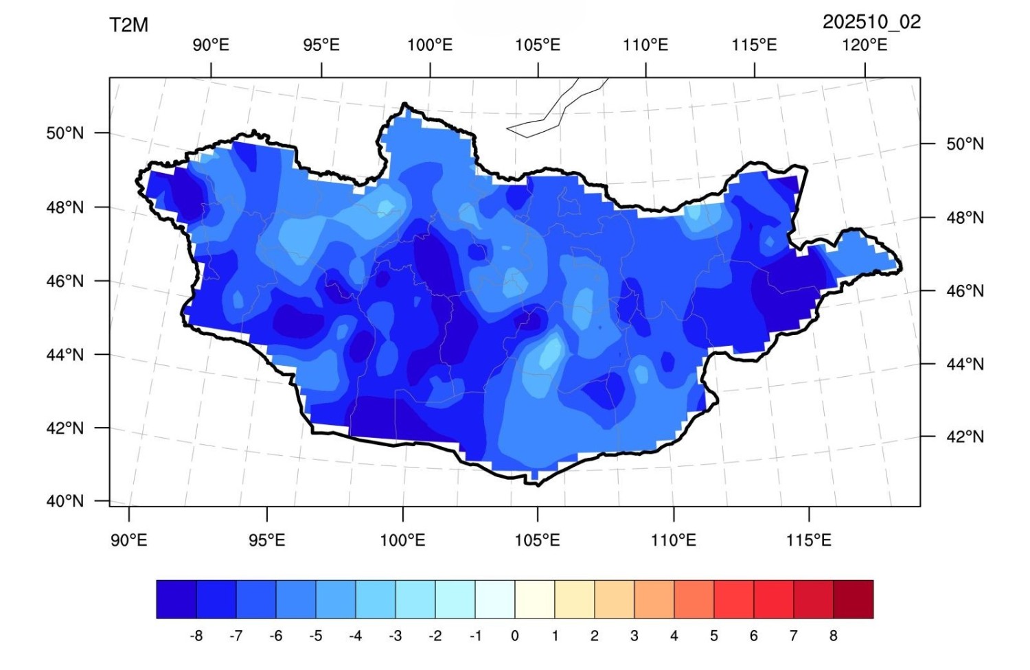 Аравдугаар сарын дунд 10 хоногийн /2025.10.11-20/ агаарын дундаж температур +2 градус дулаан байдаг бол энэ жил дундаж температур -6.9 градусаар хүйтэн буюу -4.9 градус байжээ.