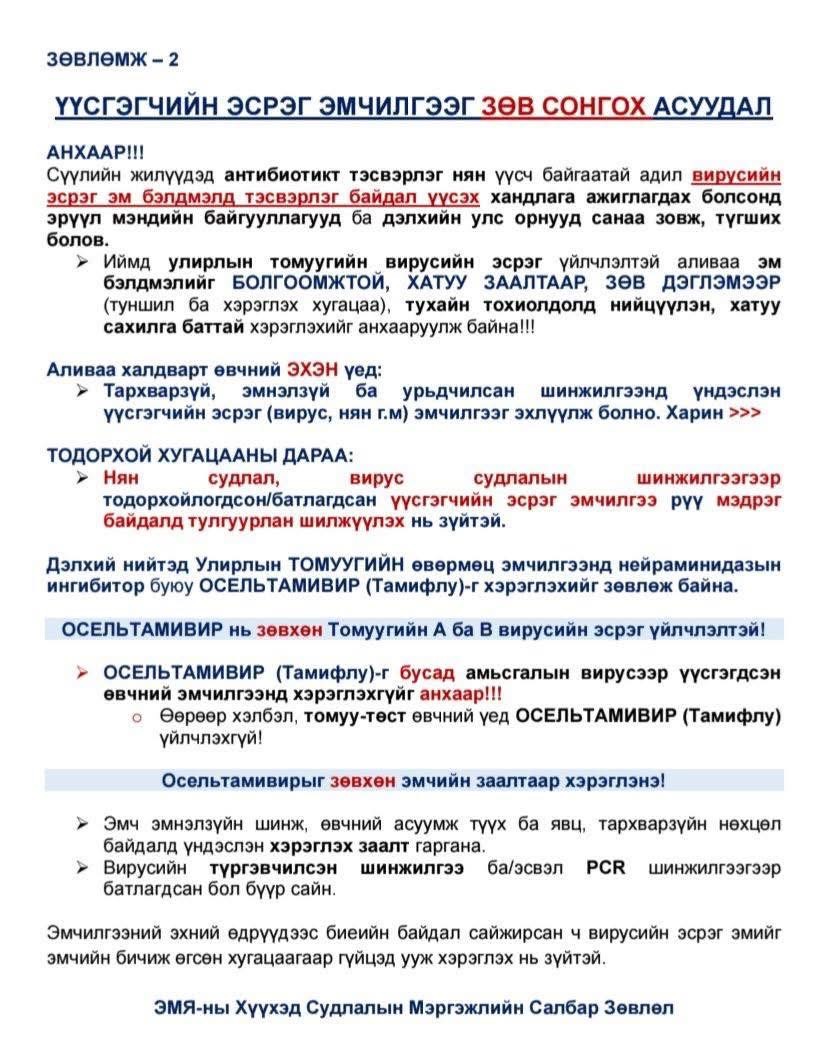 Эрүүл мэндийн яамны мэргэжлийн салбар зөвлөлөөс дараах зөвлөмжийг гаргажээ. Товчхоноор, томуугийн үед Осельтамивирыг дур мэдэн хэрэглэж болохгүй, заавал эмчийн заалтаар хэрэглэх юм байна.