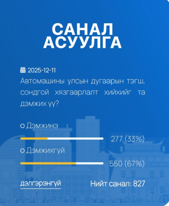 Өчигдөр /2025.12.11/ орой эхэлсэн санал асуулгад өнөөдрийн 07:40 цагийн байдлаар нийт 827 иргэн оролцсоноос 67 хувь буюу 550 нь тэгш, сондгойгоор хязгаарлахыг дэмжихгүй гэсэн байна.