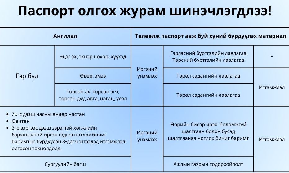 | Гадаад паспортыг авга, нагац, үеэл нь төлөөлж авах боломжтой боллоо |