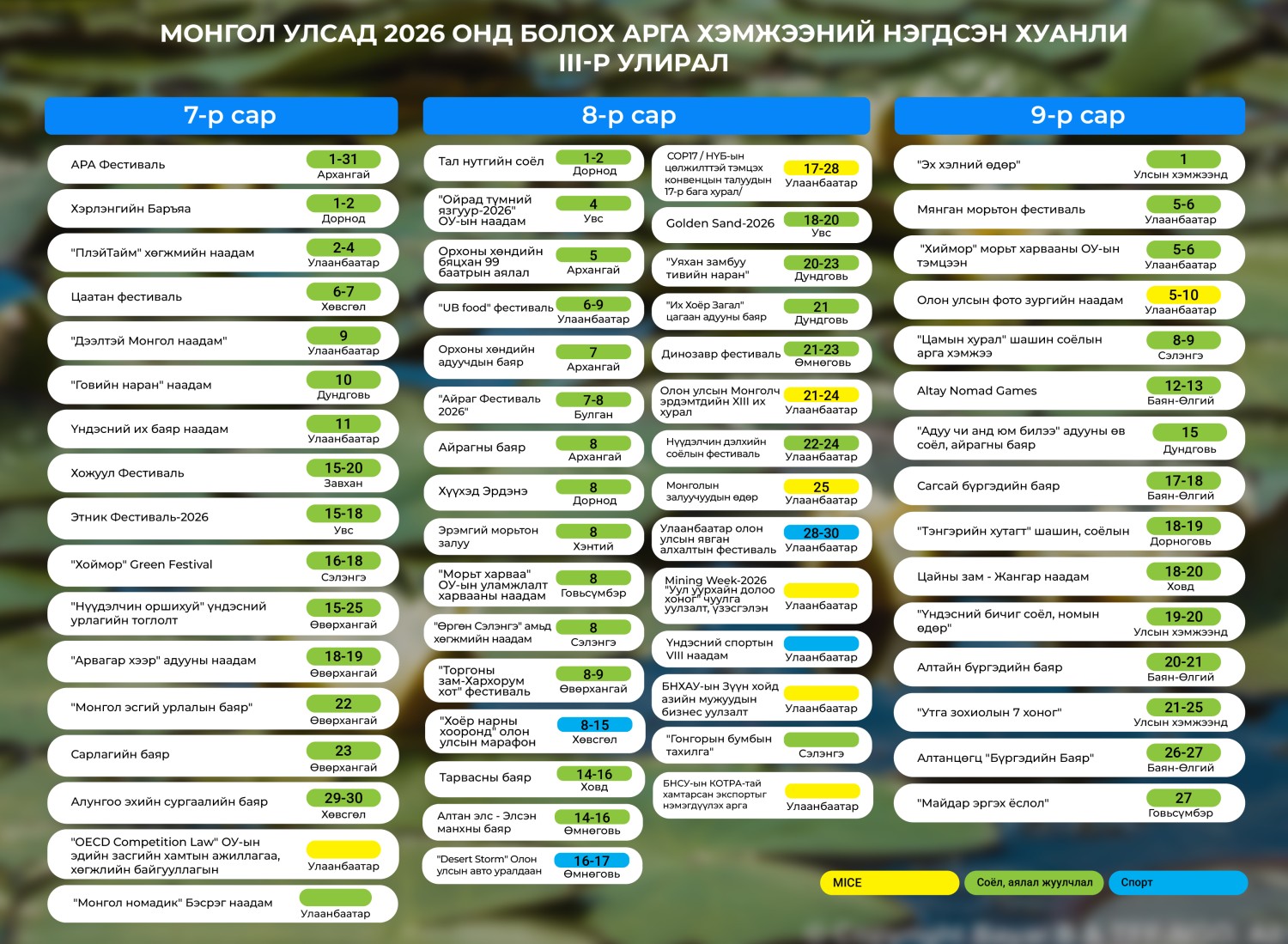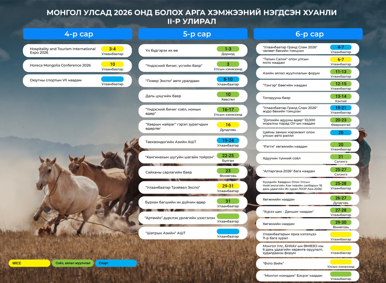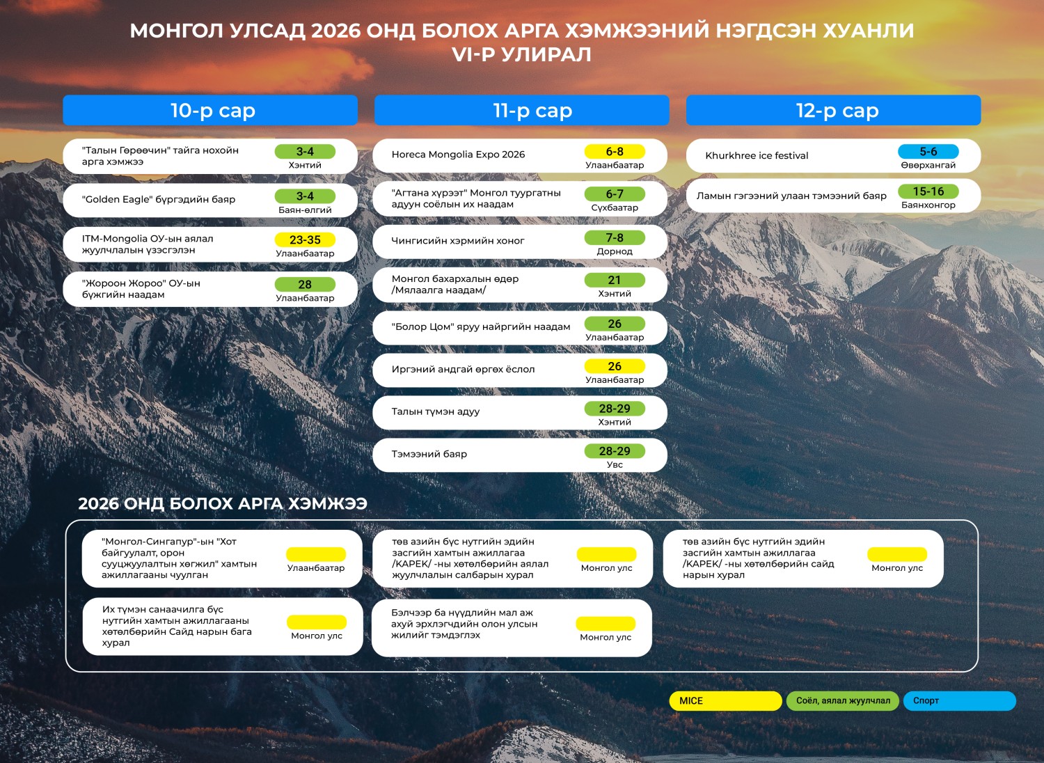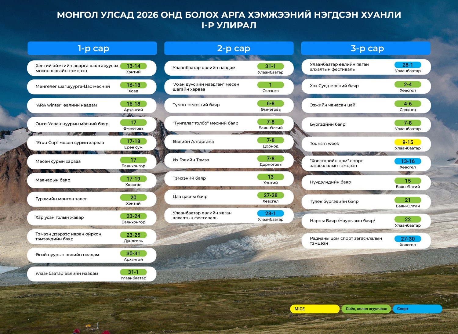 Монгол Улсад 2026 онд соёл, аялал жуулчлал, спортын чиглэлээр зохион байгуулагдах хурал, зөвлөгөөн, үзэсгэлэн арга хэмжээний нэгдсэн цаглаврыг нийслэл, 21 аймаг, төрийн байгууллагууд, мэргэжлийн холбоодын саналыг үндэслэн нэгтгэж, Засгийн газрын 2025 оны 12 дугаар сарын 24-ний өдрийн хуралдаанаар танилцууллаа.