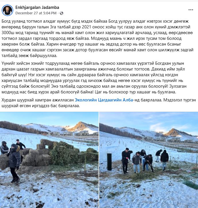 Энэ талаар иргэн Ж.Энхжаргал "Хашааг сэргээн засаж дотор буулгасан өвсийг манай хамт олон шилжүүлж задгай талбайд зөөж байршууллаа. Үүнийг хийсэн эзнийг тодруулахад нөгөө байгаль орчноо хамгаалах үүрэгтэй Богдхан уулын дархан цаазат газрын хамгаалалтын захиргааны ажилчид болохыг тогтоов. Дахиад ийм зүйл байхгүй шүү. Нэг хэсэг хүмүүс нь сайн дураараа байгаль орчноо хамгаалах үйлсэд нэгдэн хариуцсан талбайд моднуудаа ургуулах гэд хичээж байхад нөгөө хэсэг хүмүүс нь түүнийг нь сүйтгээд байж болохгүй. Энэ талбайд одоохондоо мал ан амьтан оруулах болоогүй. Зулзаган моднууд нас биед хүрэх арай болоогүй байна. Цаг нь болохоор түр хашааг нь буулгана. Хурдан шуурхай хамтран ажилласан Экологийн Цагдаагийн Алба-нд баярлалаа. Мэдээлэл түргэн шуурхай өгсөн иргэддээ бас баярлалаа" гэв.