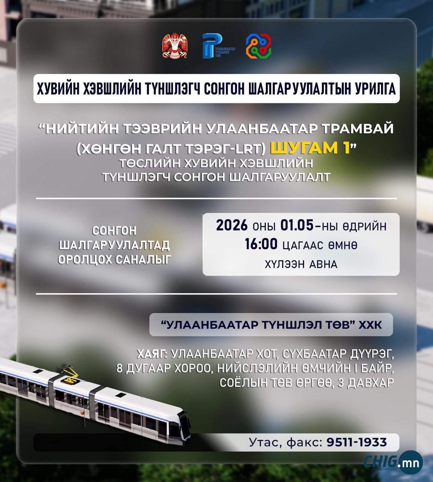 Нийслэлийн Засаг даргын Тамгын газар нь Монгол Улсын болон гадаад улсын хуулийн этгээд, түүний нэгдлийг “Нийтийн тээврийн Улаанбаатар Трамвай (Хөнгөн галт тэрэг-LRT) шугам 1”-ийн “Зураг төсөл, төсвийг боловсруулах, барих, ашиглах, шилжүүлэх” (DBFOM) төрлийн сонгон шалгаруулалтад урьж байна.