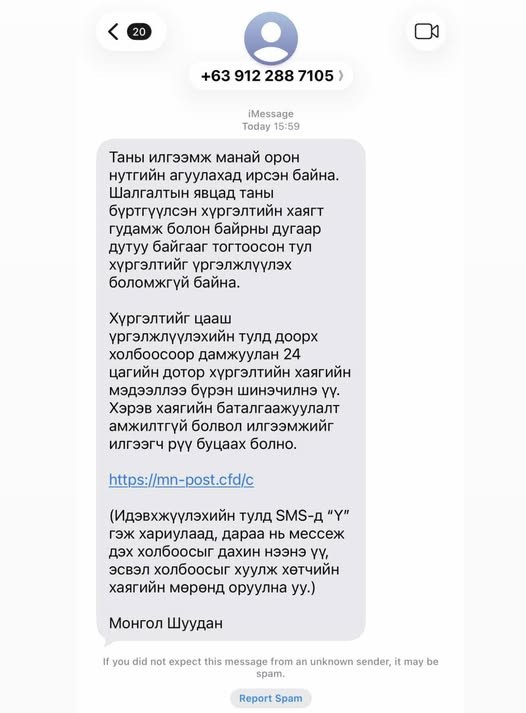 Дээрх төрлийн хуурамч мессеж нь ихэвчлэн “Илгээмж саатсан”, “Хаяг баталгаажуулна уу”, “Төлбөр төлж илгээмжээ авна уу” зэрэг агуулгатай бөгөөд албан ёсны бус цахим холбоос агуулсан байдаг. Иймд иргэд та бүхэн үл таних дугаараас ирсэн мессеж дэх холбоос дээр дарж нэвтрэхгүй байх, регистрийн дугаар, банкны картын мэдээлэл, нууц үг, баталгаажуулах код зэрэг хувийн мэдээллийг цахимаар дамжуулан өгөхгүй байх, “Монгол шуудан” ХК болон бусад байгууллагууд мессежээр дамжуулан нууц мэдээлэл шаарддаггүй болохыг анхааруулж байна.