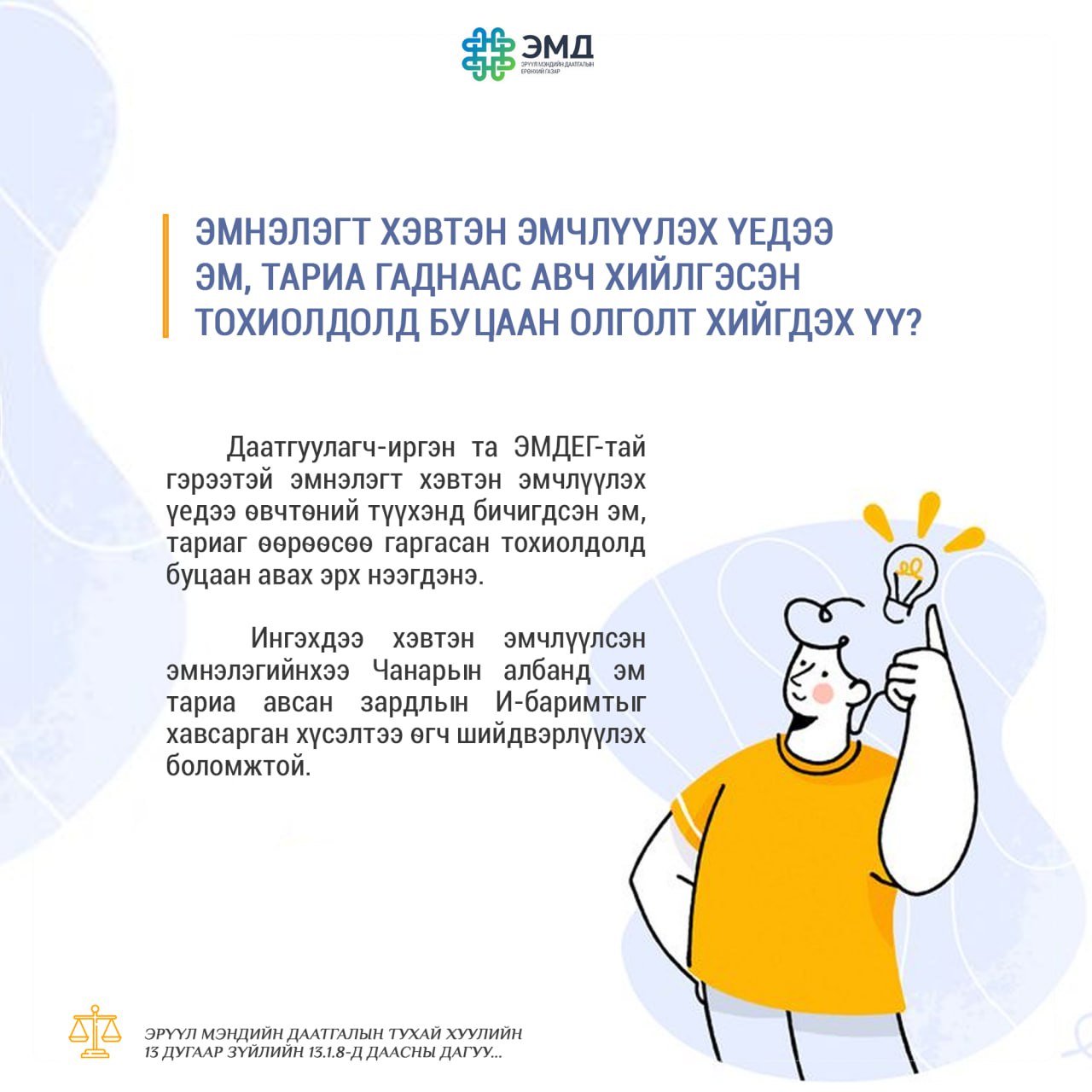 | Эмнэлэгт гаднаас авч хэрэглэсэн эм тарианы мөнгийг буцаан авах боломжтой |