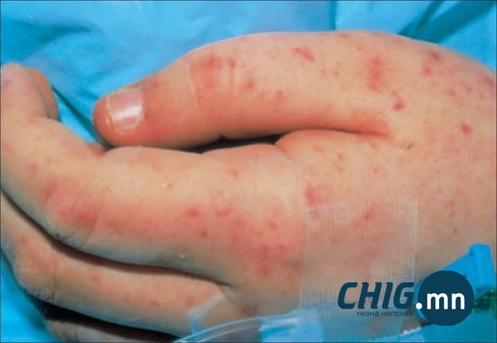 • Арьсан дээр ягаан, хөхөвтөр жижиг цусархаг тууралт гарах (даралтаар арилахгүй)