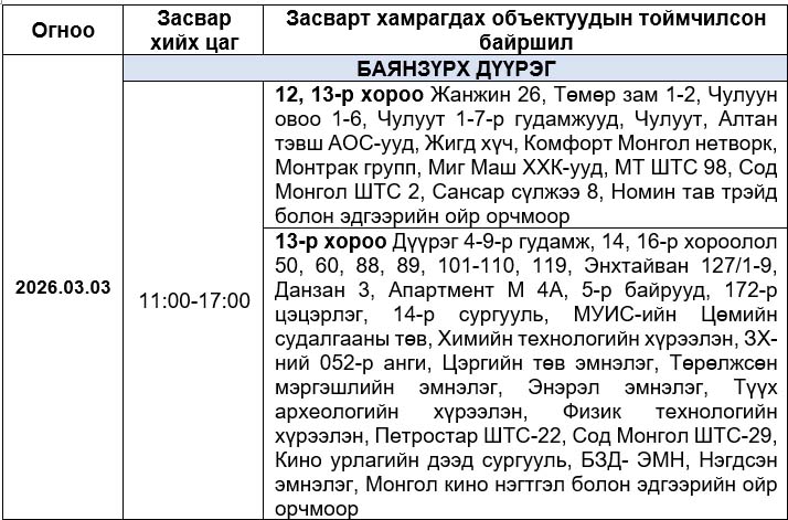 УБЦТС ТӨХК-аас 2026 оны 03 дугаар сарын 03-ны өдөр цахилгаан шугам тоноглолд засвар хийх тоймчилсон байршил, цагийн хуваарийг мэдээлж байна. Хуваарийн дэлгэрэнгүй: https://www.tog.mn/account/5