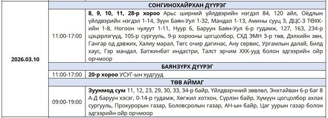 Цахилгааны хязгаарлалт хийж, цахилгаан шугам тоноглолд засвар үйлчилгээ хийх байршлуудын мэдээллийг хүргэж байна. Төв аймгийн зарим хэсэгт 09:00-19:00 цагт цахилгаан хязгаарлана.