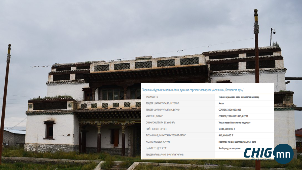 | Таравчамбуулин хийдийн Авга дуганыг ₮1.8 тэрбумаар сэргээн засварлана |