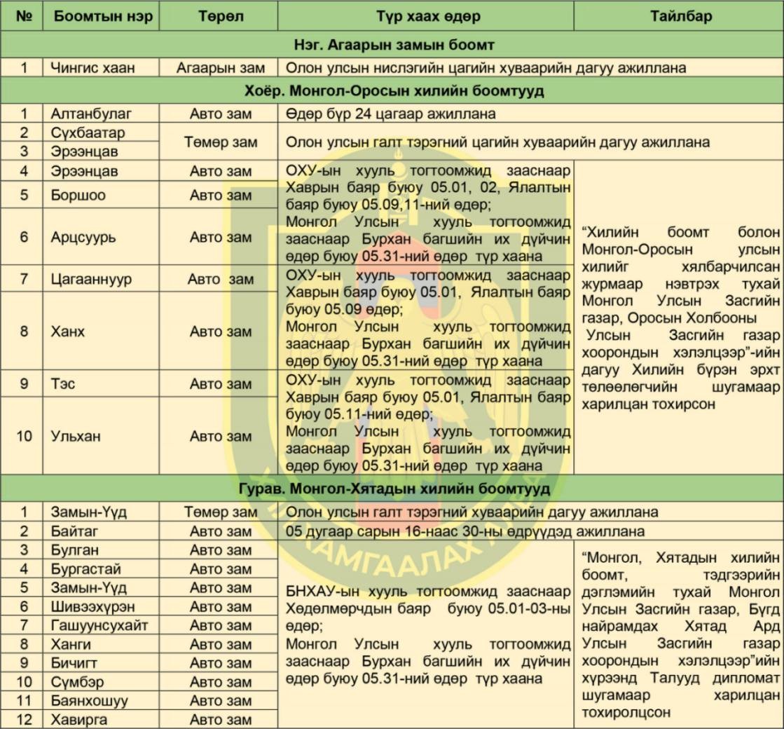 Монгол-Хятадын хилийн боомтуудын тухайд, БНХАУ-ын Хөдөлмөрчдийн баяр тавдугаар сарын 1-3-нд тохиож байгаа тул доорх боомтуудыг түр хаана.