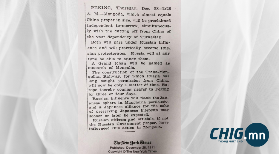 1911 онд Богд Хаант Монгол Улсын тусгаар тогтнолыг Нью-Йорк Таймс сонин шуурхай мэдээлж байв
